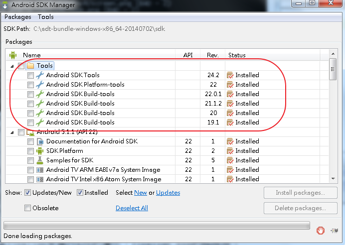 如果沒有找到build-tools或版本太低時,可以藉由Android SDK Manager來下載更新: